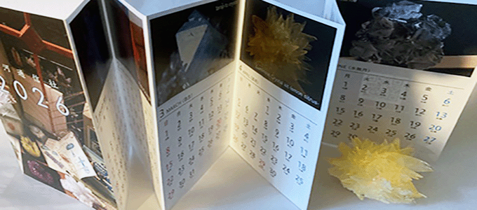 | カレンダーの内容は2026年の月別日付に当社製品の結晶育成キットの完成見本画像がおもとなります。 |